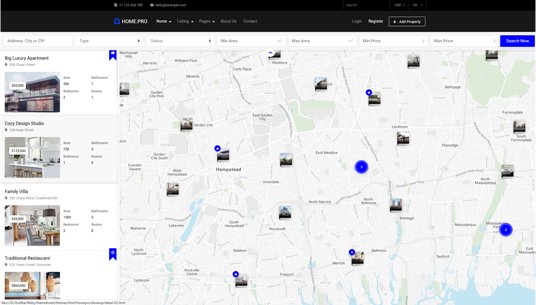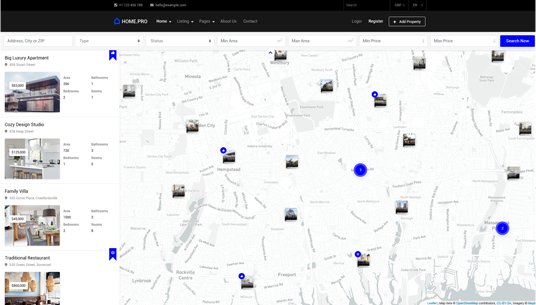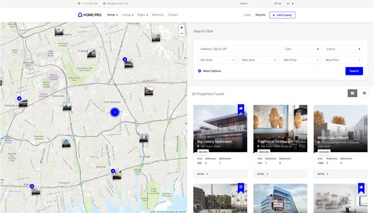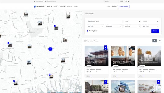 Choose between twenty map homepages, four slider or four static background image homepages. Every with different form style.